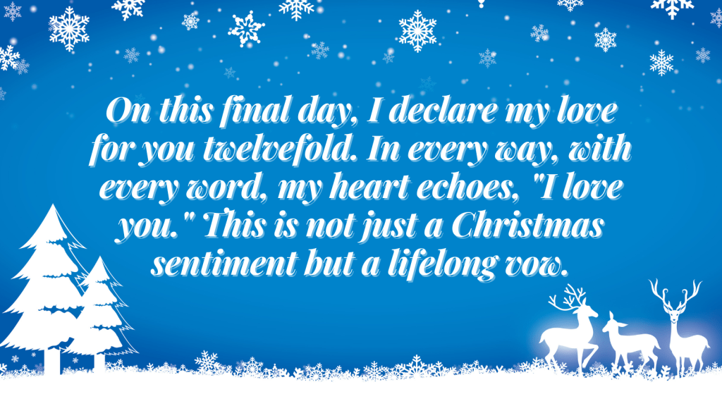 On this final day, I declare my love for you twelvefold. In every way, with every word, my heart echoes, “I love you.” This is not just a Christmas sentiment but a lifelong vow.
