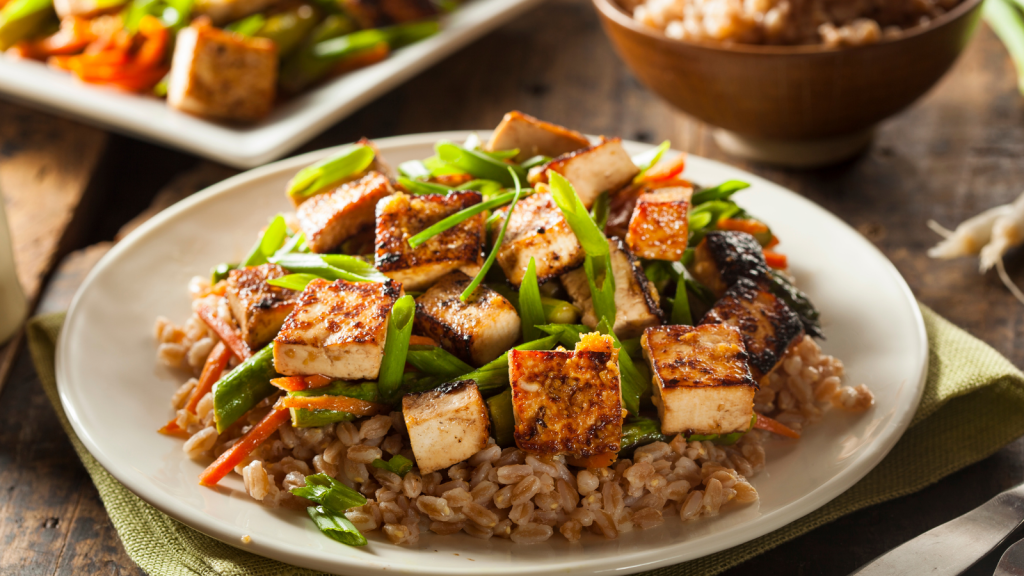 - Grilled tofu (150g) with stir-fried vegetables (1 cup) and brown rice (1/2 cup).