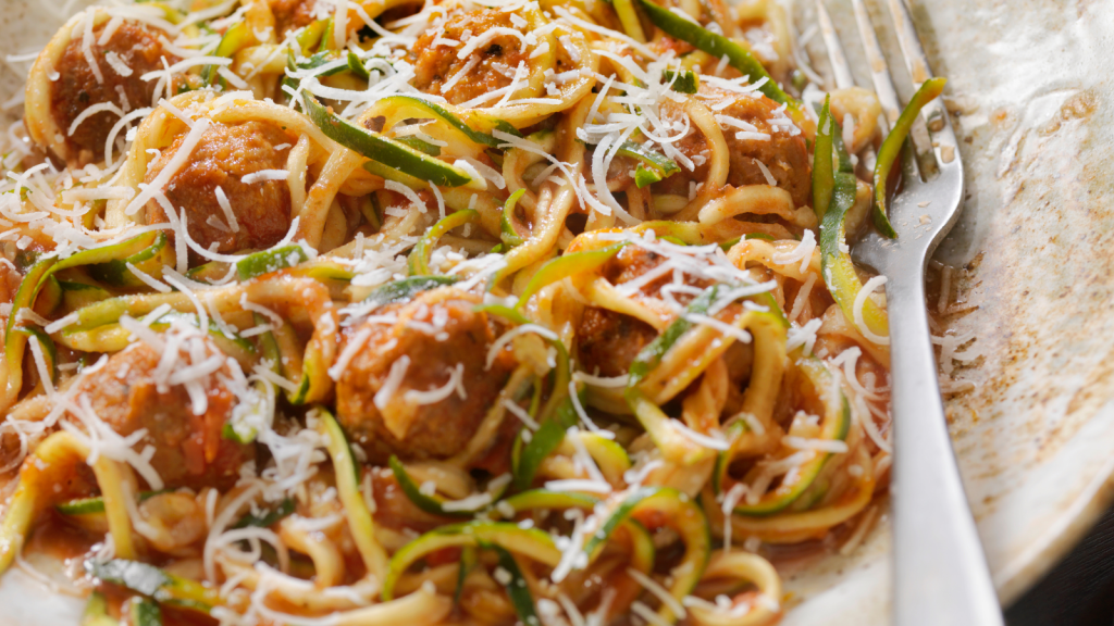 - Turkey meatballs (150g) with zucchini noodles (1 cup) and marinara sauce.