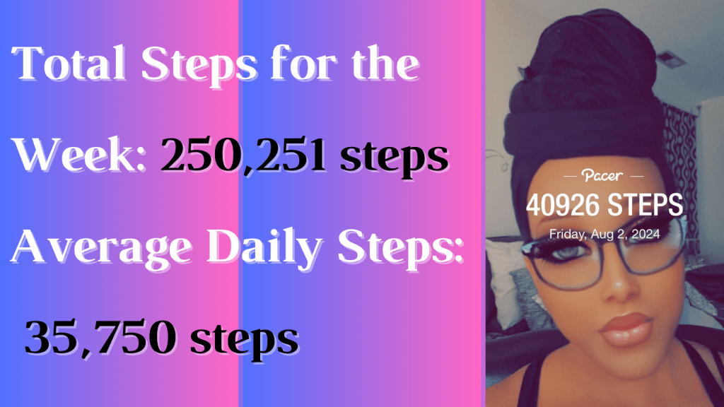 This week, I was on fire! I achieved a total of 250,251 steps, averaging about 35,750 steps per day. Here’s a breakdown of my daily step count: