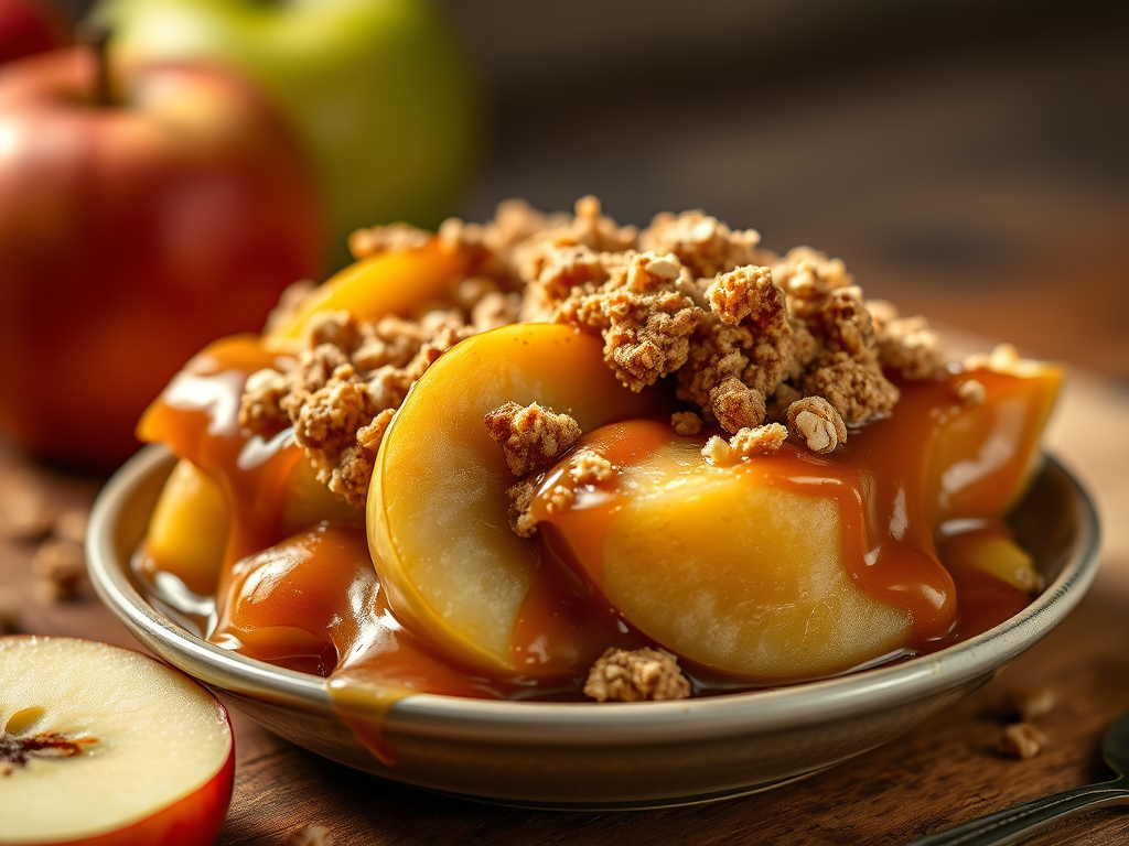 - Directions: Layer apples and caramel in a baking dish, top with oat crumble, and bake until golden and bubbly.