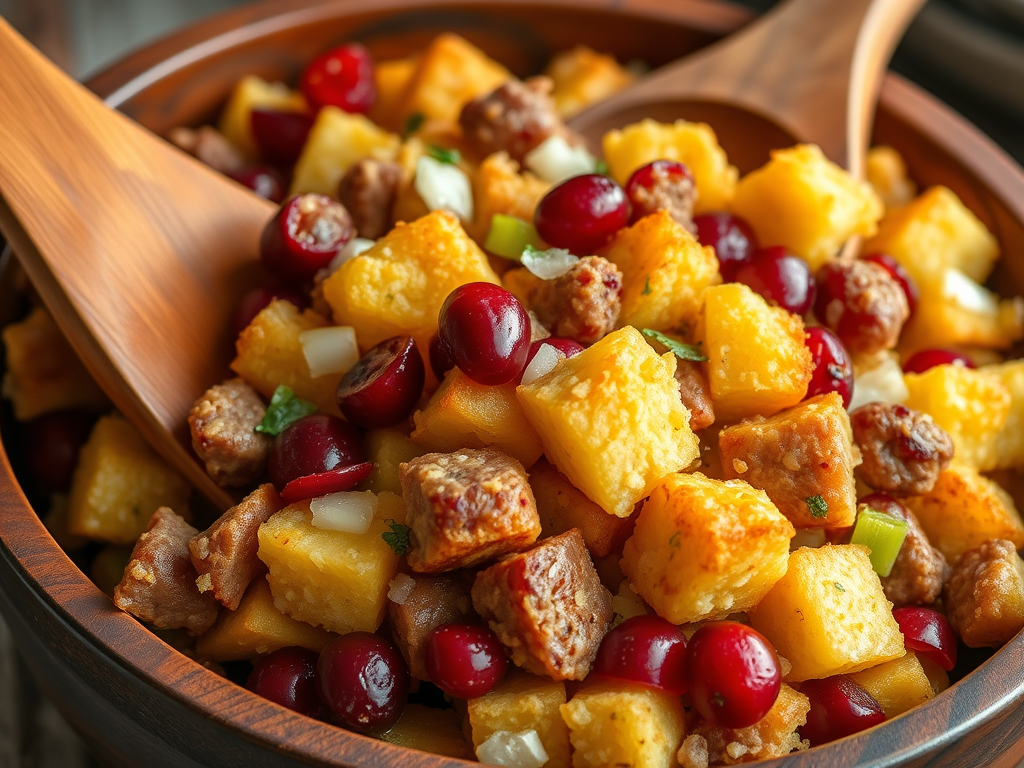 - Ingredients: Cornbread, ground sausage, dried cranberries, onions, celery, chicken broth, and seasonings.