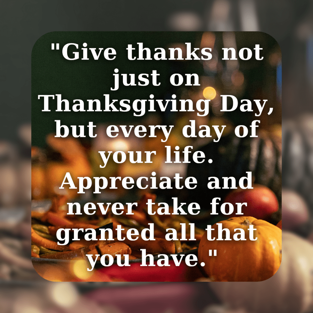 - “Give thanks not just on Thanksgiving Day, but every day of your life. Appreciate and never take for granted all that you have.” – Catherine Pulsifer