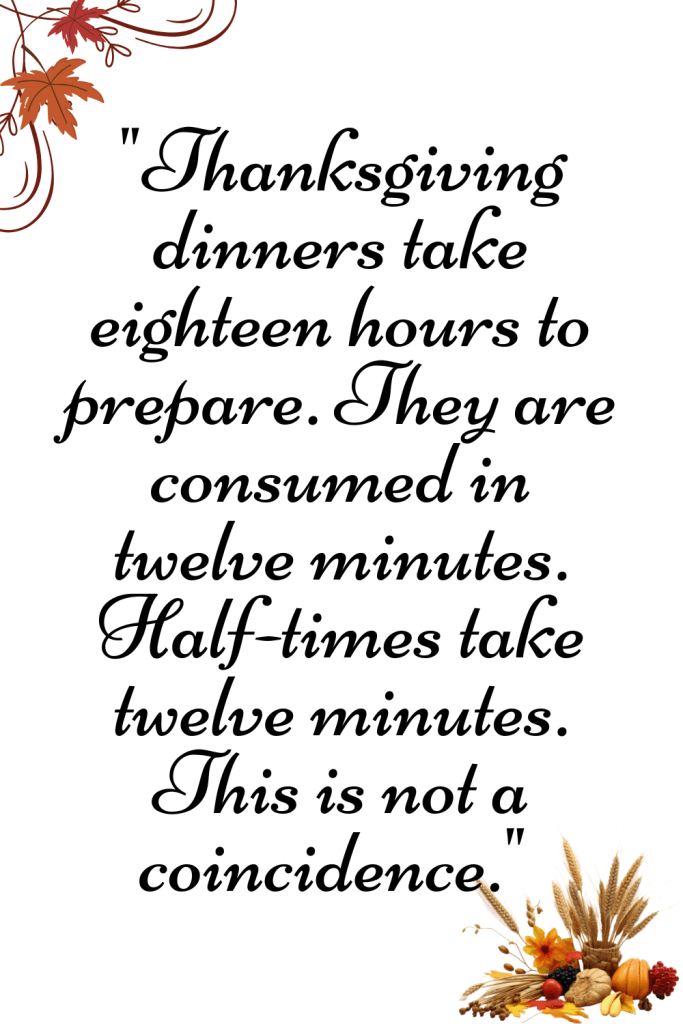 - “Thanksgiving dinners take eighteen hours to prepare. They are consumed in twelve minutes. Half-times take twelve minutes. This is not a coincidence.” – Erma Bombeck