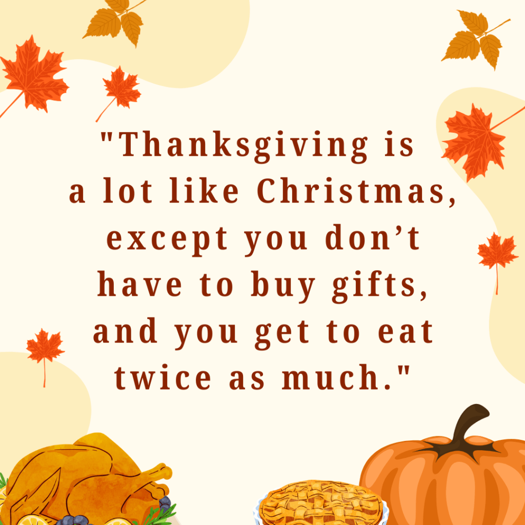 - “Thanksgiving is a lot like Christmas, except you don’t have to buy gifts, and you get to eat twice as much.” – Anonymous