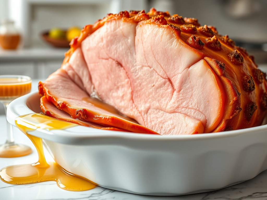 A showstopper dish featuring a perfectly seasoned prime rib roast. The result? A juicy, melt-in-your-mouth roast, ideal for special holiday occasions. - Honey Glazed Ham
