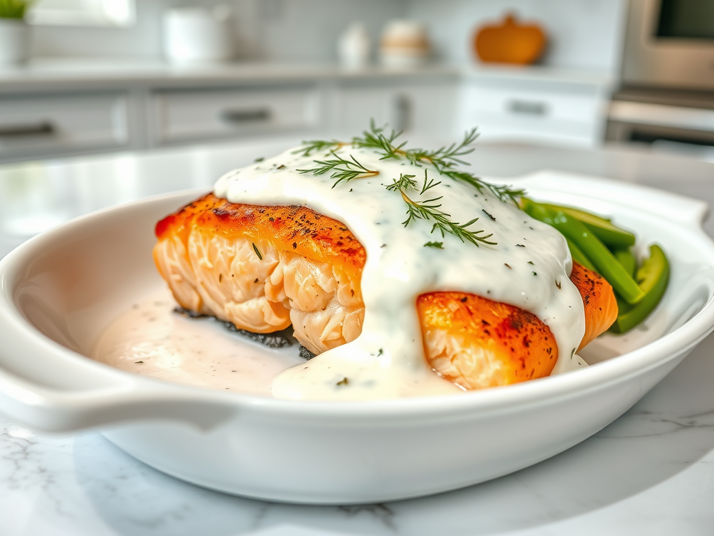 A hearty casserole of chicken, wild rice, vegetables, and cream, baked to golden perfection. - Salmon with Dill Sauce