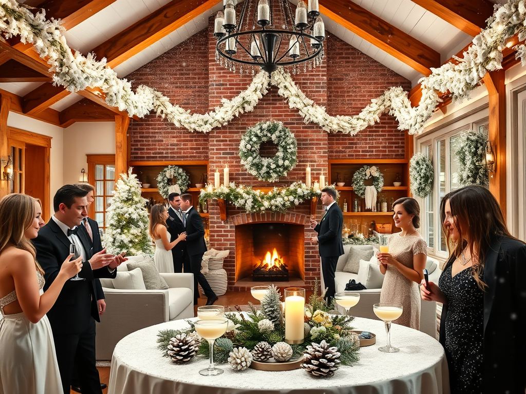 Imagine stepping into a magical woodland with twinkling fairy lights, lush evergreen garlands, and frosted pinecones. Decorate your tables with mossy runners, wooden chargers, and gold-dipped pinecones. Serve mushroom-stuffed pastries, forest berry tarts, and botanical cocktails. Create a whimsical photo backdrop with a canopy of twinkling lights and faux snow.