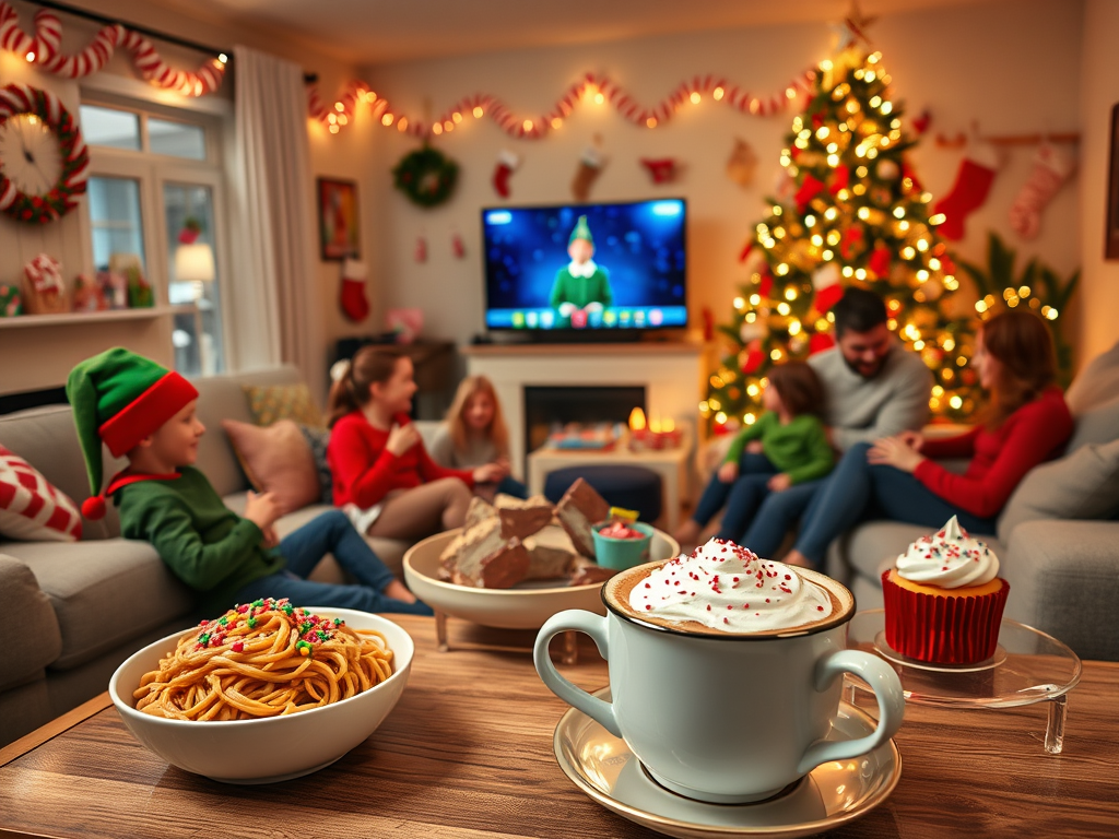 Celebrate with Buddy the Elf vibes! Decorate with candy canes, syrup bottles, and colorful paper chains. Serve spaghetti with maple syrup (for the brave), candy-themed desserts, and oversized hot chocolate. Play scenes from the movie for laughs.