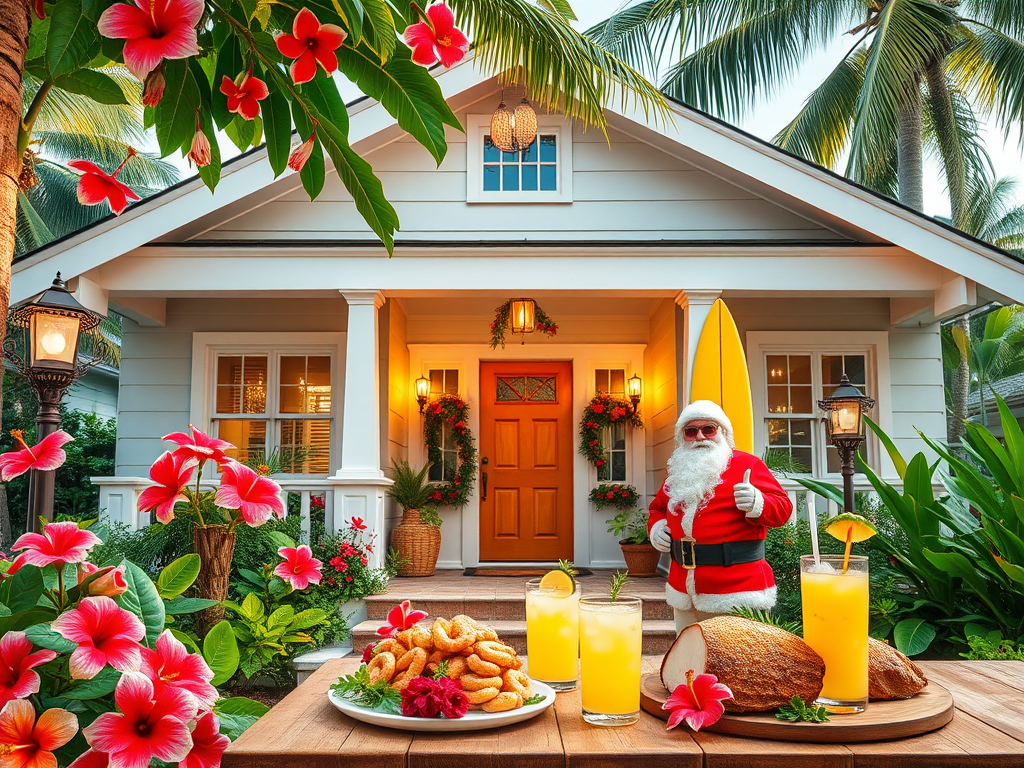 Swap snowflakes for palm trees and host a festive luau. Decorate with bright hibiscus flowers, tiki torches, and a surfboard photo booth. Serve coconut shrimp, pineapple-glazed ham, and tropical cocktails like Mai Tais. Don’t forget the Santa in sunglasses!