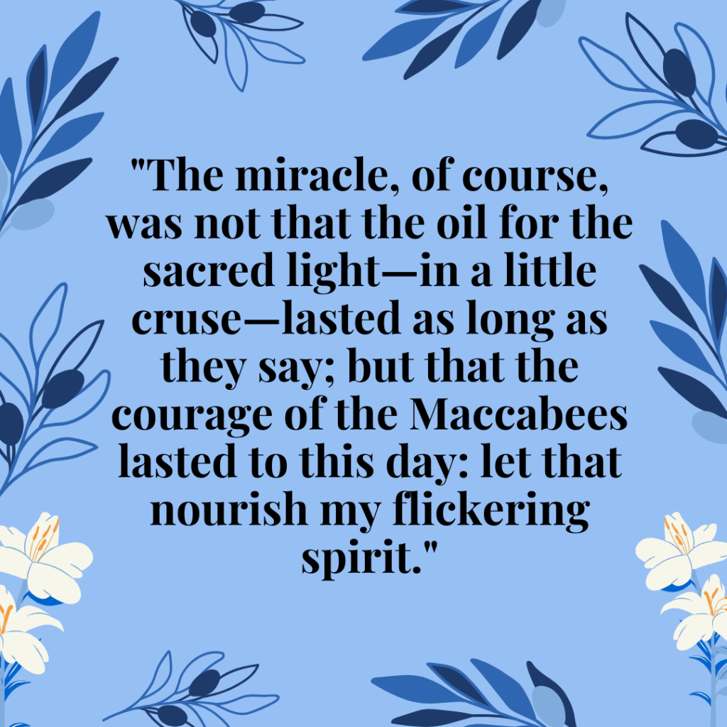 - “The miracle, of course, was not that the oil for the sacred light—in a little cruse—lasted as long as they say; but that the courage of the Maccabees lasted to this day: let that nourish my flickering spirit.” – Charles Reznikoff