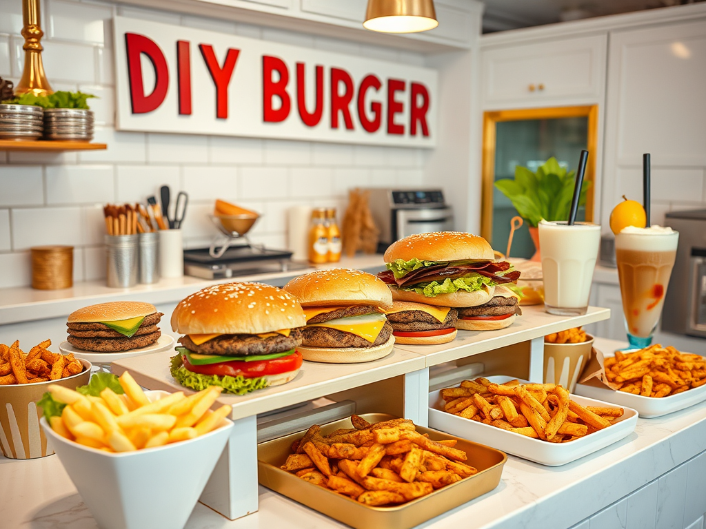 Set up a DIY burger station with patties (beef, chicken, or veggie) and a variety of toppings. Include lettuce, tomatoes, onions, pickles, avocado, and gourmet cheeses. Add fun sides like sweet potato fries and milkshakes.