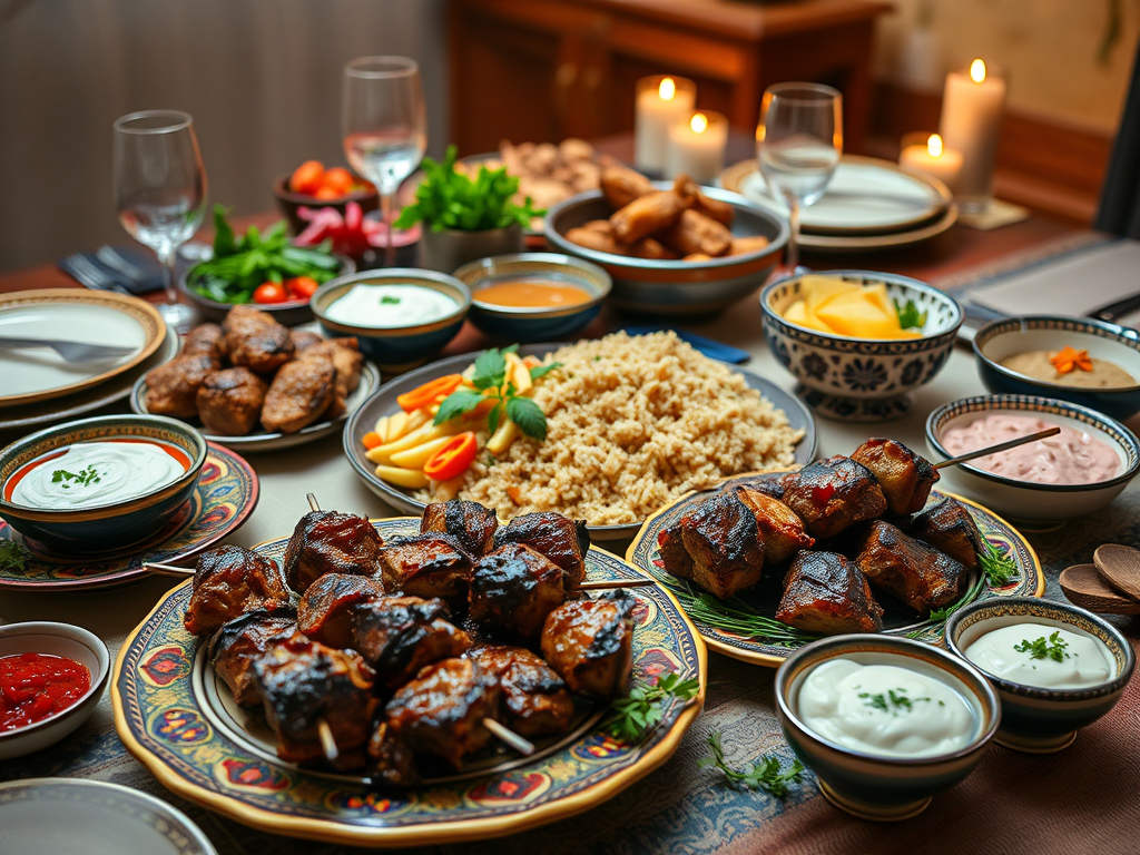 Introduce your guests to Middle Eastern flavors with a festive menu. Serve kebabs, roasted lamb, rice pilaf, and a variety of dips like muhammara and tzatziki. Offer baklava or rosewater panna cotta for dessert.