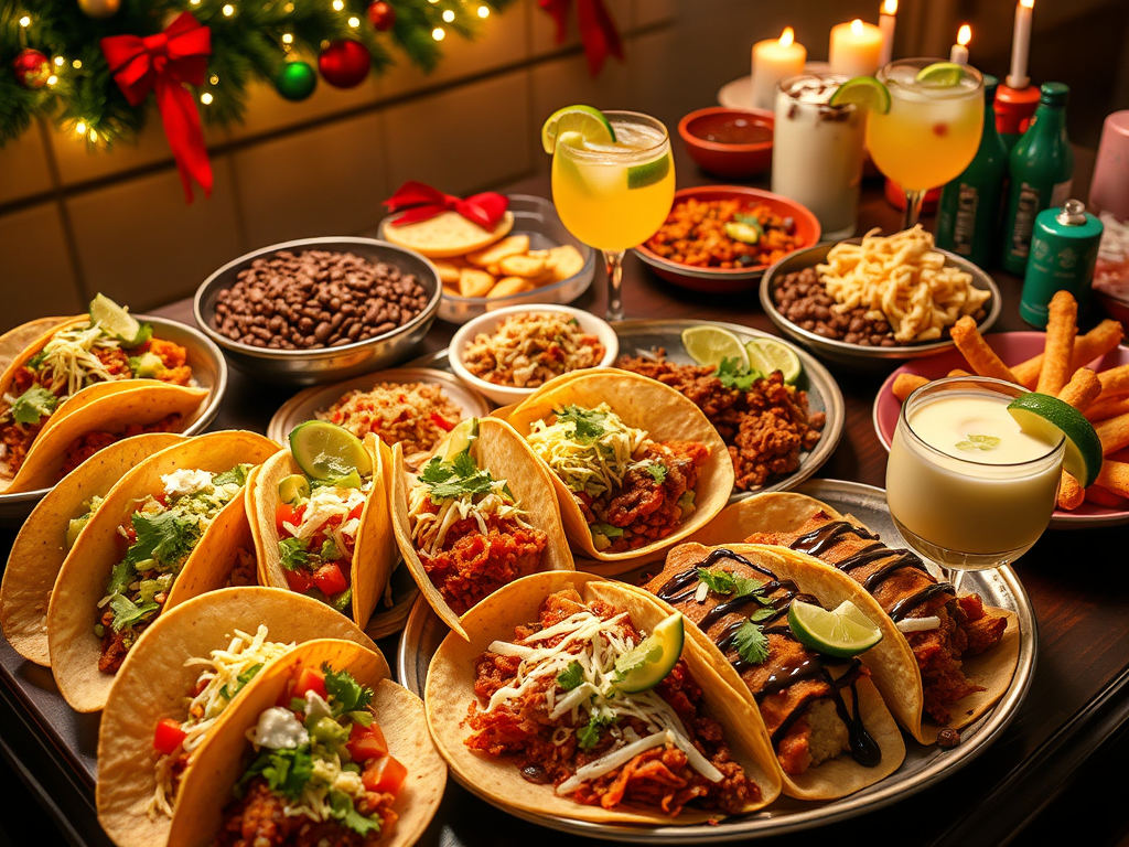 Spice up your Christmas dinner with a vibrant Mexican-themed feast. Include a taco bar with soft and hard shells, seasoned meats, beans, and fresh toppings like pico de gallo, guacamole, and cilantro. Add enchiladas, quesadillas, and churros with a chocolate dipping sauce for dessert. Pair it with festive margaritas or non-alcoholic horchata.