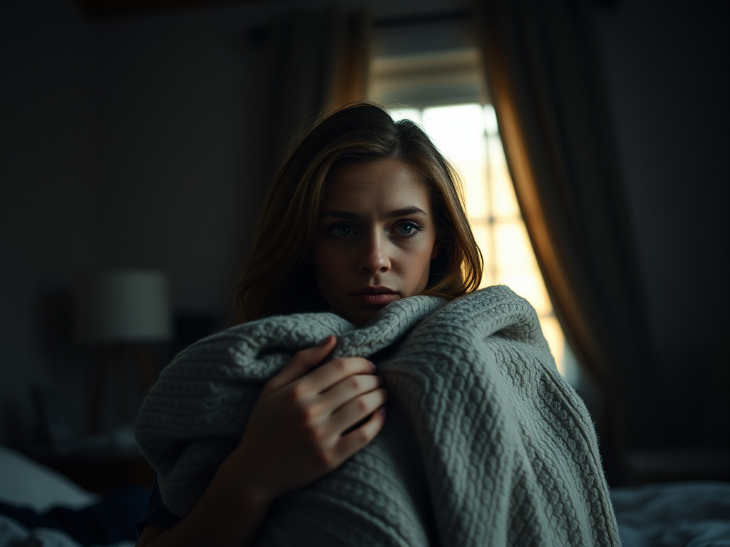 “Morning,” she said groggily, sitting up and pulling the blanket tighter around her.