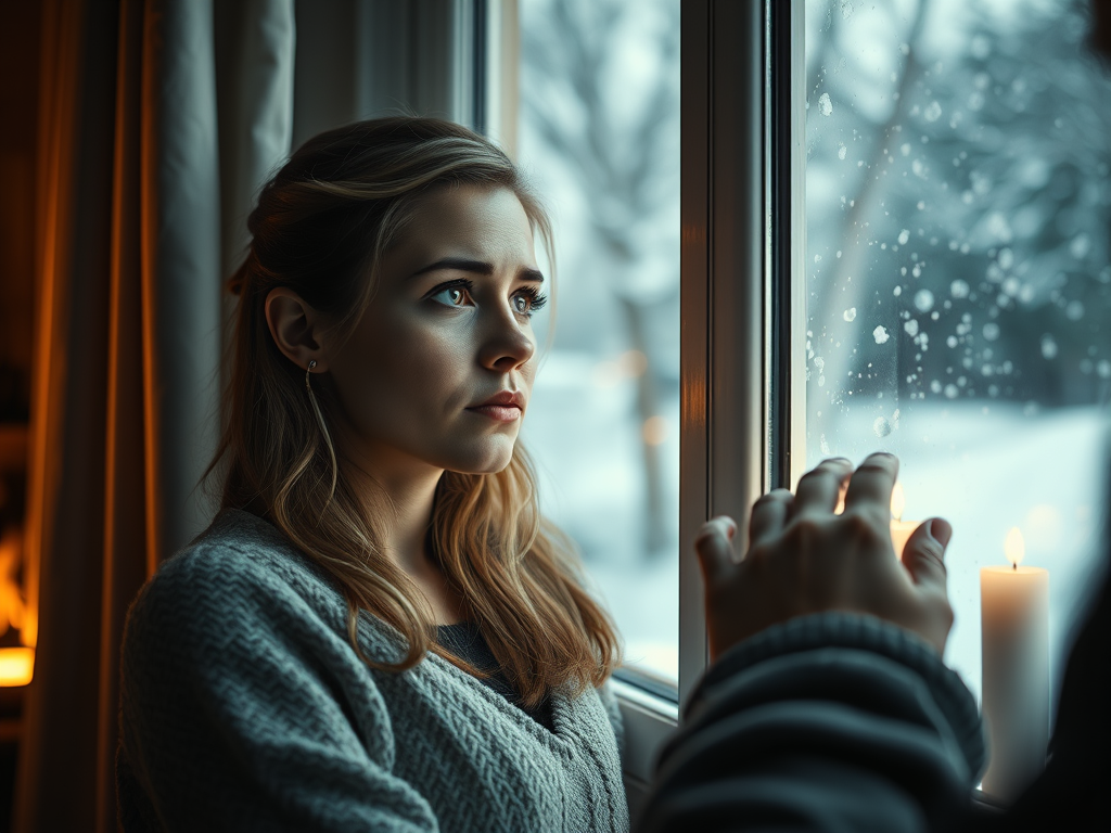 Claire, already awake, was sitting by the window, her gaze fixed on the glistening snow outside. Her face was a mix of determination and worry. Ethan approached her quietly, setting a gentle hand on her shoulder.