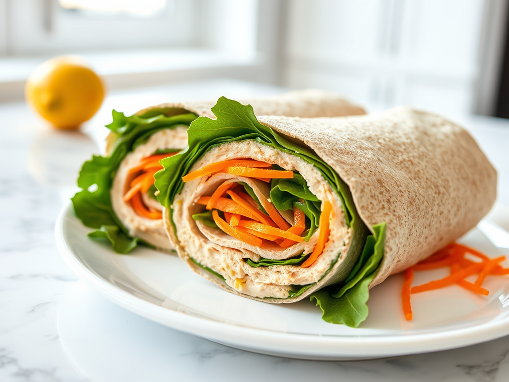 Spread hummus on a whole-grain tortilla, layer with sliced turkey, spinach, and shredded carrots, and roll it up. This is a simple, on-the-go lunch option.