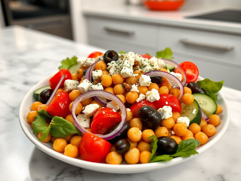 Combine chickpeas, cherry tomatoes, cucumber, red onion, olives, and feta cheese. Toss with olive oil, lemon juice, and oregano for a Mediterranean-inspired delight.