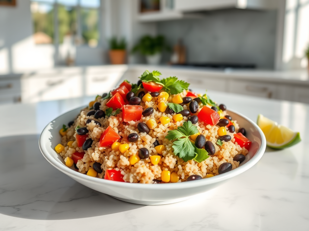 Mix cooked quinoa, black beans, corn, and diced tomatoes. Drizzle with lime juice and sprinkle with cilantro for a fresh, zesty meal loaded with fiber and plant-based protein.