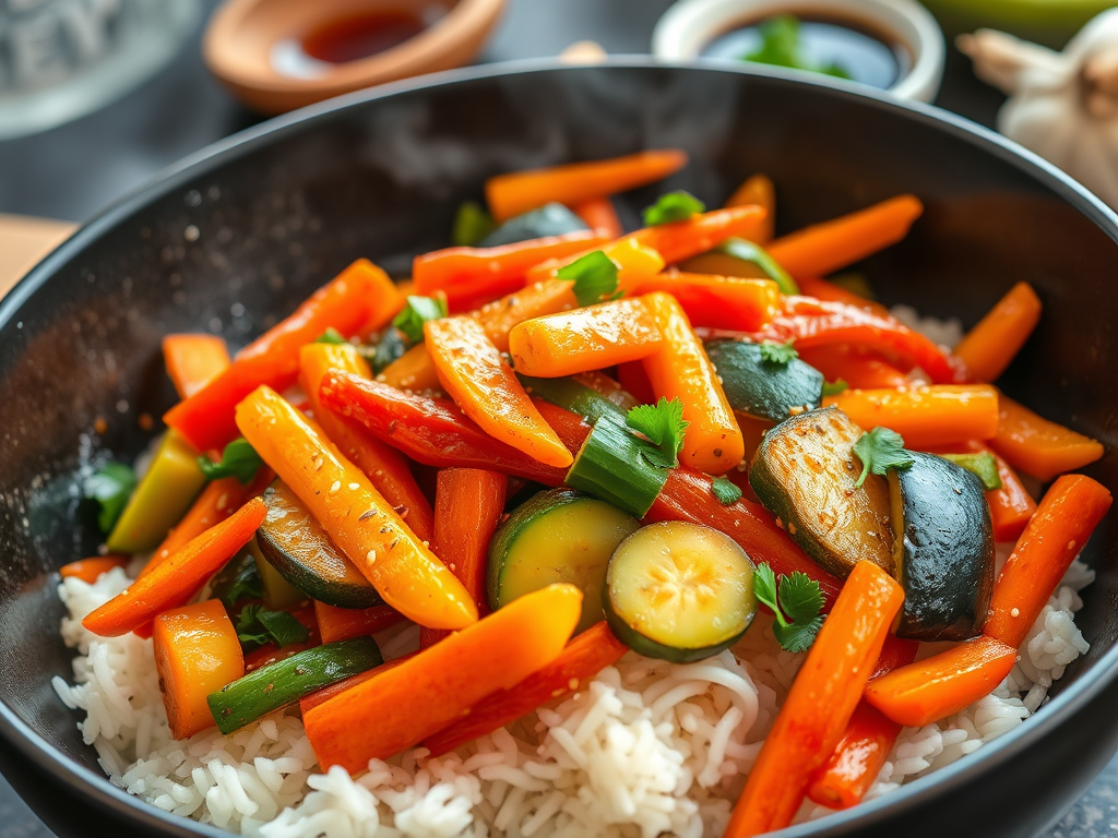 - Ingredients: Mixed veggies (carrots, bell peppers, zucchini), soy sauce, sesame oil, and garlic.