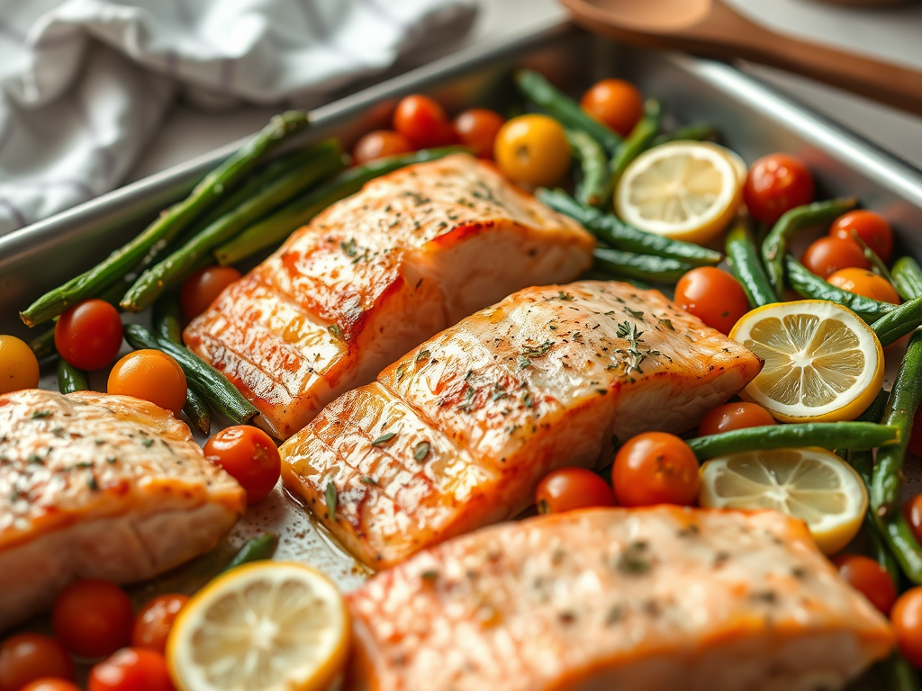 - Ingredients: Salmon fillets, cherry tomatoes, green beans, olive oil, lemon slices, and seasoning.