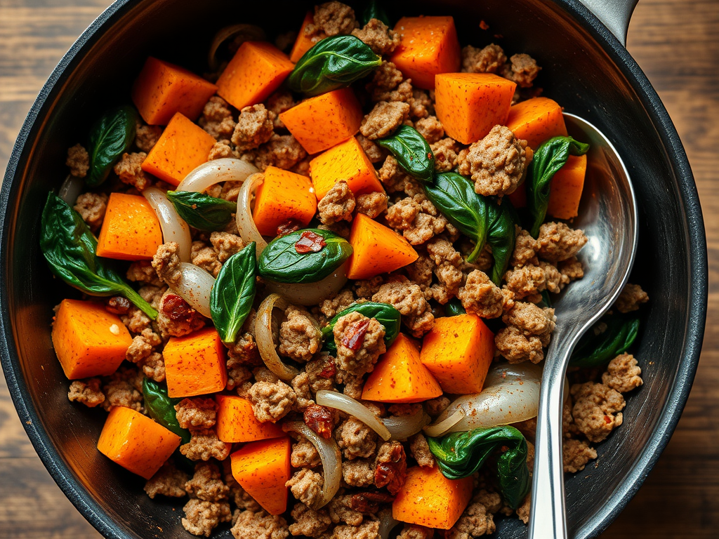 - Ingredients: Ground turkey, sweet potatoes, onions, spinach, and spices.