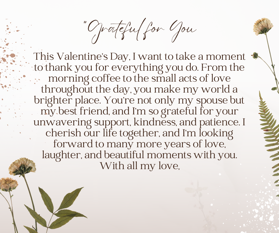 This Valentine’s Day, I want to take a moment to thank you for everything you do. From the morning coffee to the small acts of love throughout the day, you make my world a brighter place. You’re not only my spouse but my best friend, and I’m so grateful for your unwavering support, kindness, and patience. I cherish our life together, and I’m looking forward to many more years of love, laughter, and beautiful moments with you.