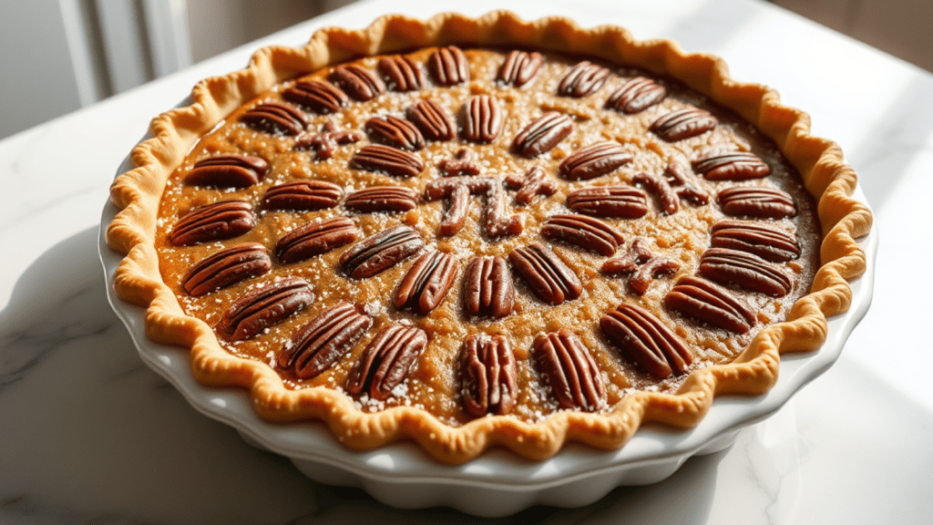 3. Pour the mixture into the pie crust and arrange the pecans on top.