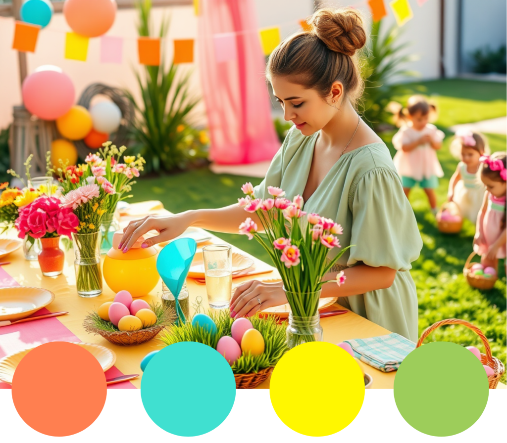 For those who love a pop of color, the Bold and Bright color scheme is for you. Think coral, turquoise, lemon yellow, and grass green—fun, vibrant, and attention-grabbing. This palette brings a modern, energetic twist to your Easter décor and adds a playful vibe to your celebrations. It’s perfect for a fun-filled Easter egg hunt or a lively Easter gathering with family and friends!