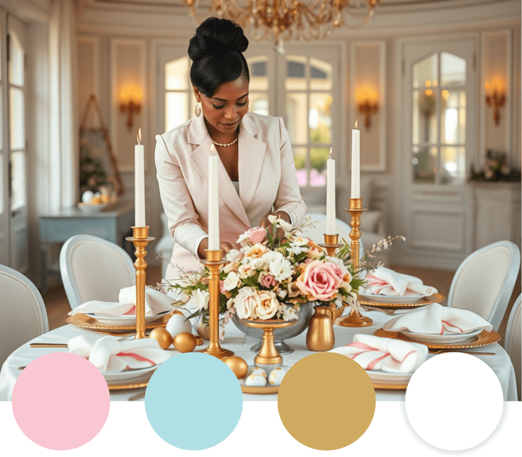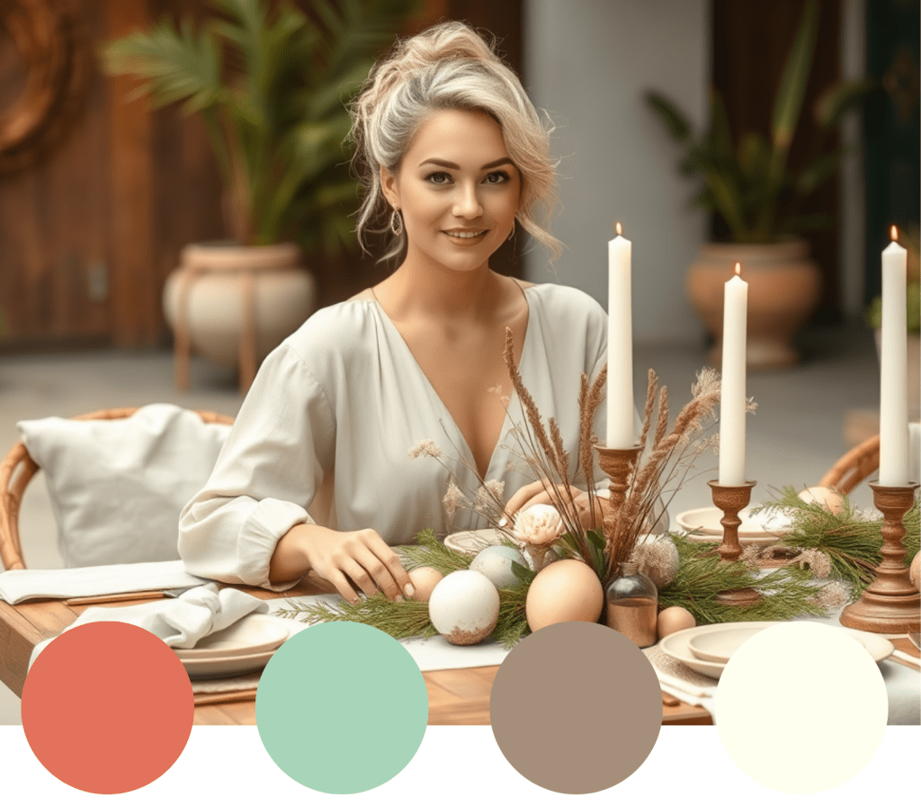 If you prefer a more natural and grounded feel, the Earthy Spring color scheme is for you. Soft terracotta, sage green, taupe, and ivory create a calming, rustic vibe that’s ideal for a nature-inspired Easter celebration. This palette pairs beautifully with wooden décor, fresh greenery, and floral arrangements for a cozy, earthy Easter atmosphere. It’s simple, chic, and perfect for those who love a more minimalist approach to spring décor.