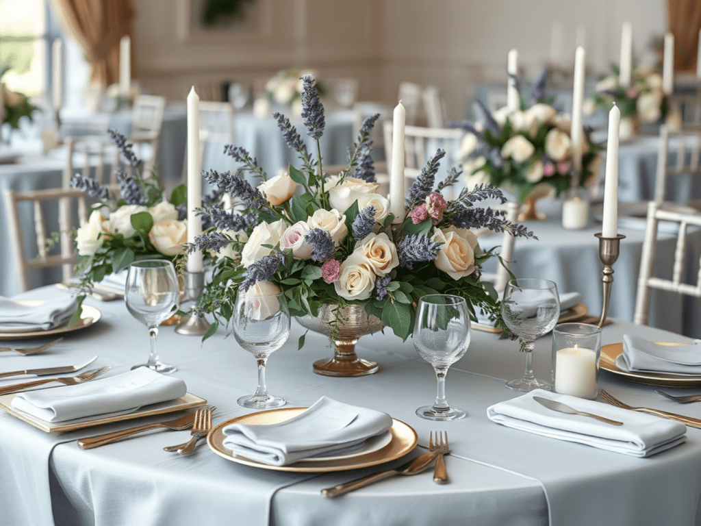 - Bridal Party Attire: Opt for dusty blue bridesmaids’ dresses paired with soft lilac accessories for a cohesive look.