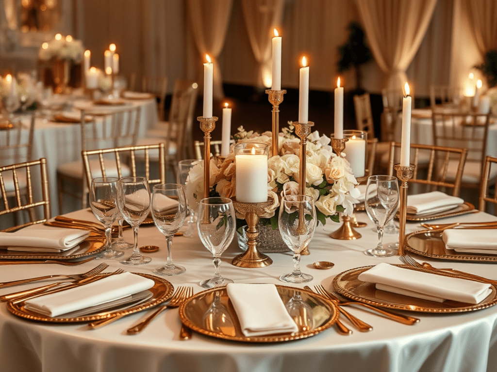 - Reception Details: Gold or silver flatware, chargers, and candles will elevate the elegance of your reception.