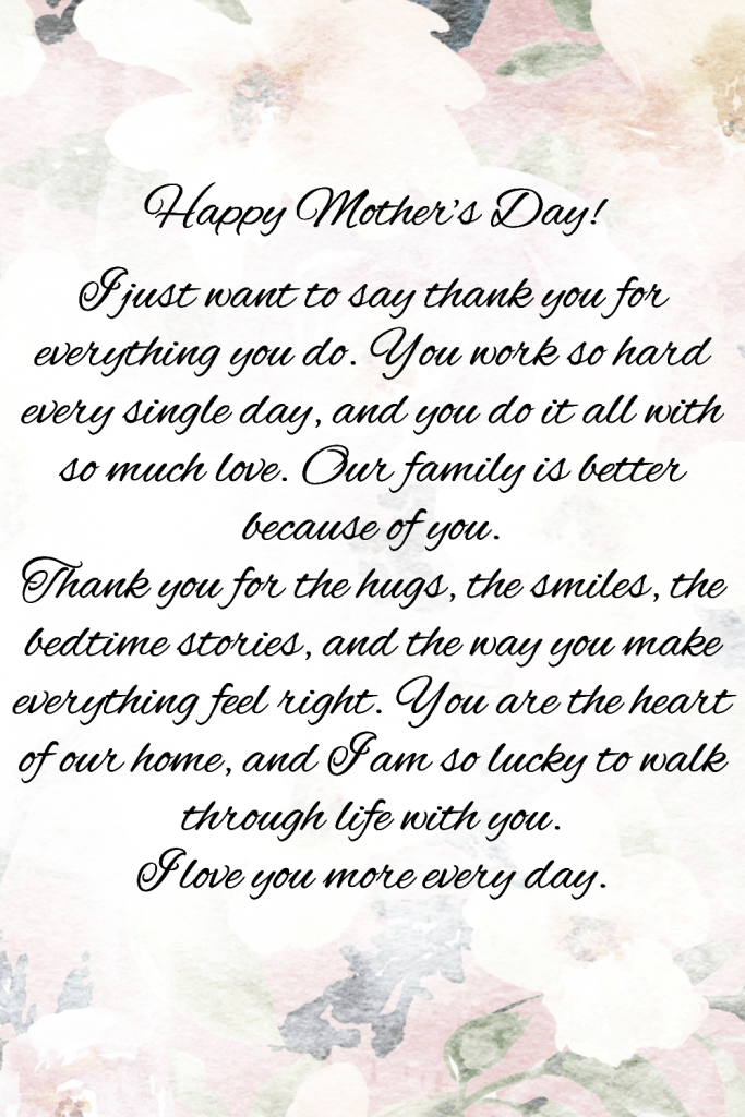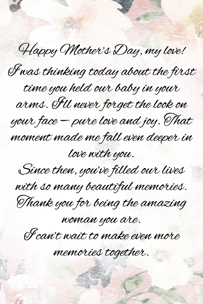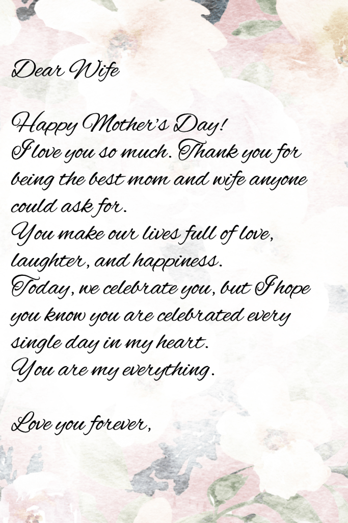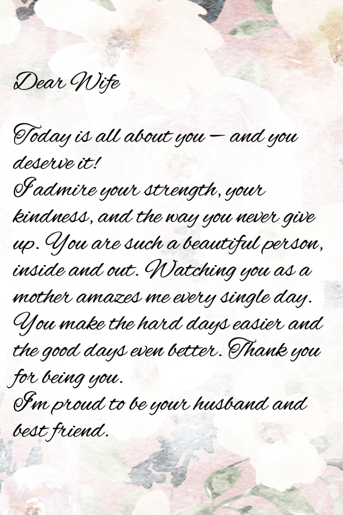 Mother’s Day isn’t just for kids to celebrate their moms — it’s also a perfect time for husbands to show extra love to their wives. I still remember the first Mother’s Day after we had our first child. My husband wrote a simple letter to me, and I cried (happy tears!). It meant more to me than any gift I could have bought. If you want to make your wife feel truly special this Mother’s Day, a heartfelt letter is the way to go!