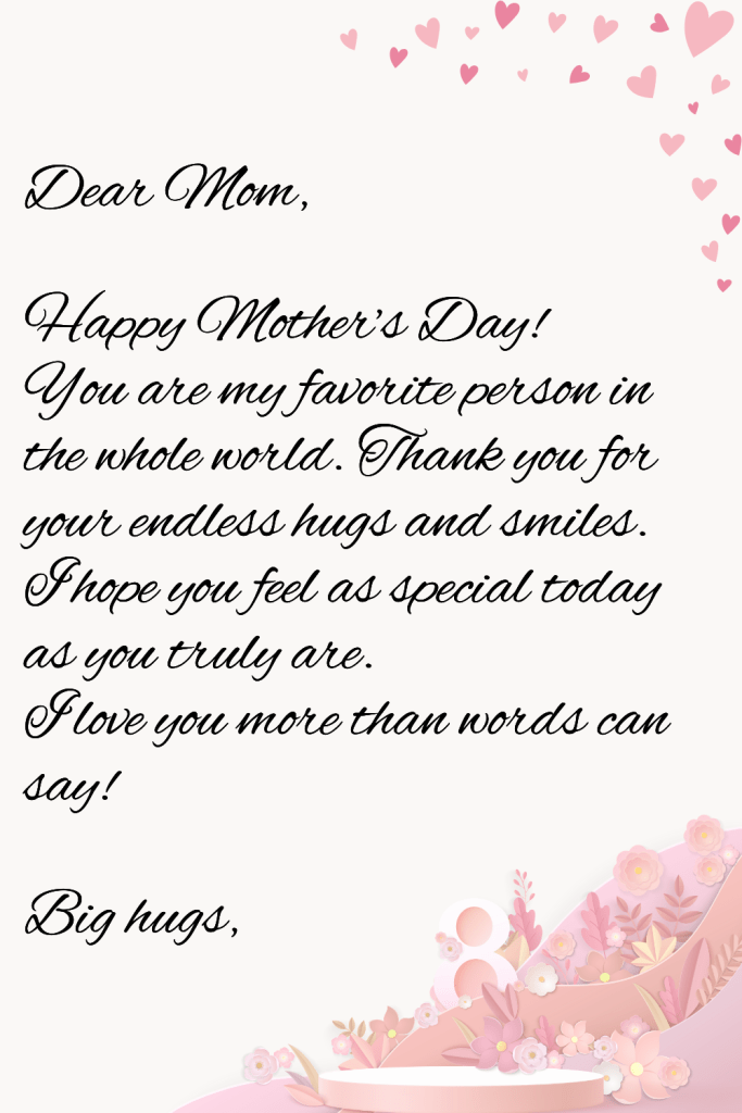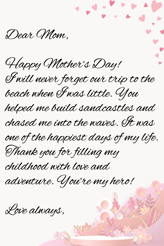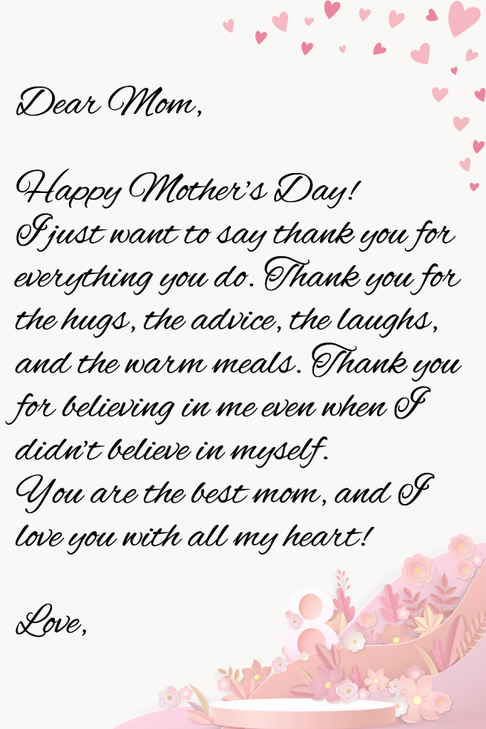 A letter to your mom doesn’t have to be long or fancy — it just has to be filled with love. This Mother’s Day, skip the store-bought cards and give her something from your heart. She’ll cherish it forever, and you might just make her tear up (in the best way)!