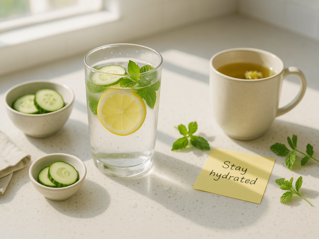 Quick Tip: Add a slice of lemon, cucumber, or mint to your water for a refreshing twist. Herbal teas, like chamomile or peppermint, can also help you stay hydrated without caffeine.