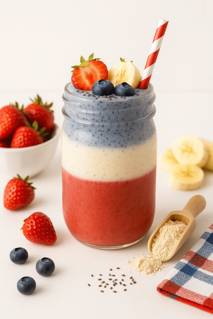 Blend frozen strawberries, almond milk, and protein powder for the red layer. Use banana and Greek yogurt for the white, and finish with a blueberry + chia seed layer.