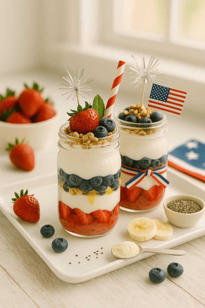 Make It Festive: Serve in mini mason jars with a cute flag or sparkler topper. They’re red, white, blue and beautiful.