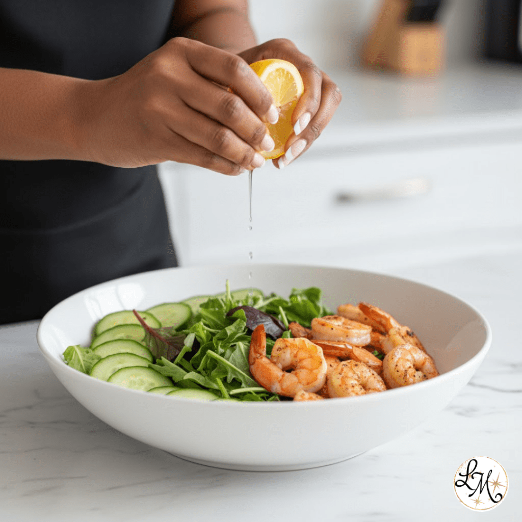Grilled shrimp salad with mixed greens and lemon dressing.