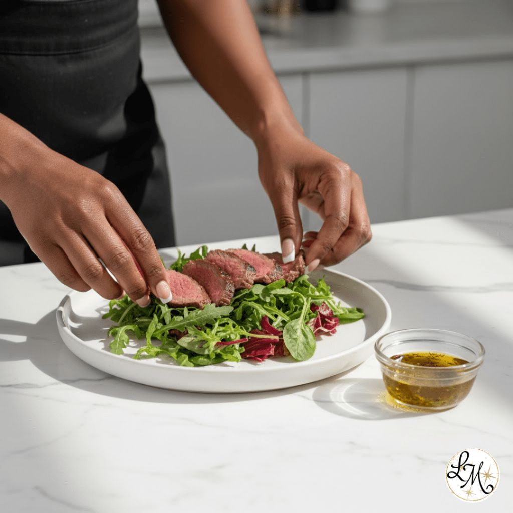 Lean beef (120g) over mixed greens with olive oil vinaigrette.