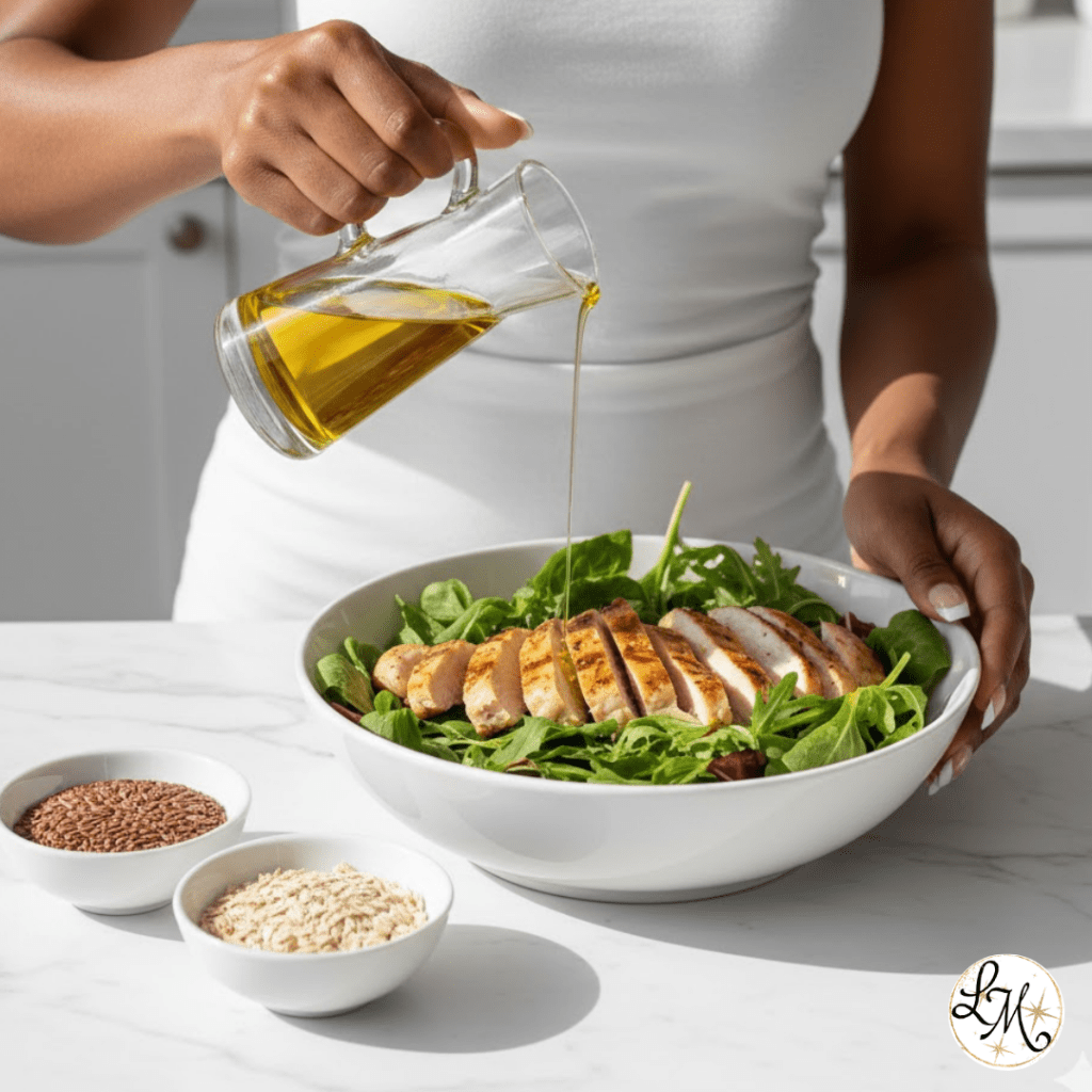 - Fats/Seeds: Chia seeds, Flaxseeds, Almonds, Walnuts, Olive oil, Balsamic vinegar.