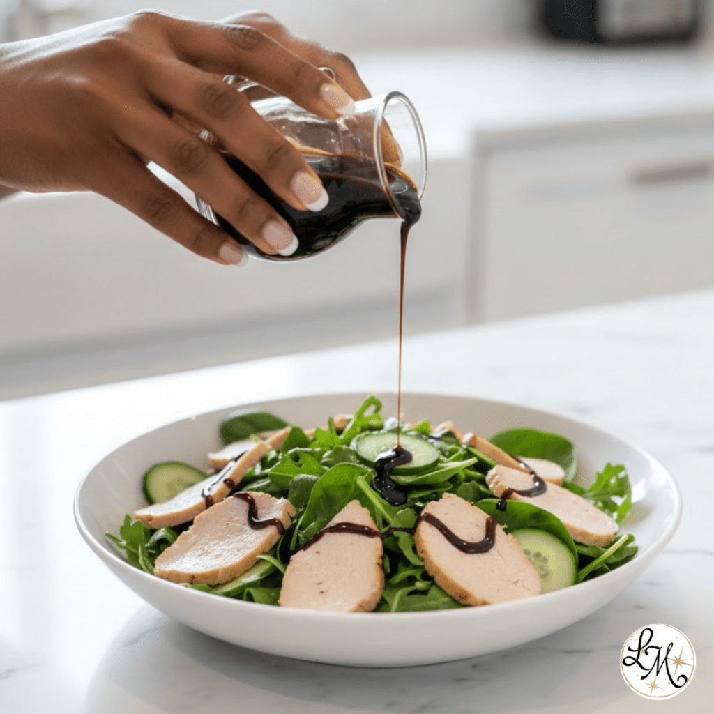Turkey breast (150g) with mixed greens, cucumbers, and balsamic dressing.