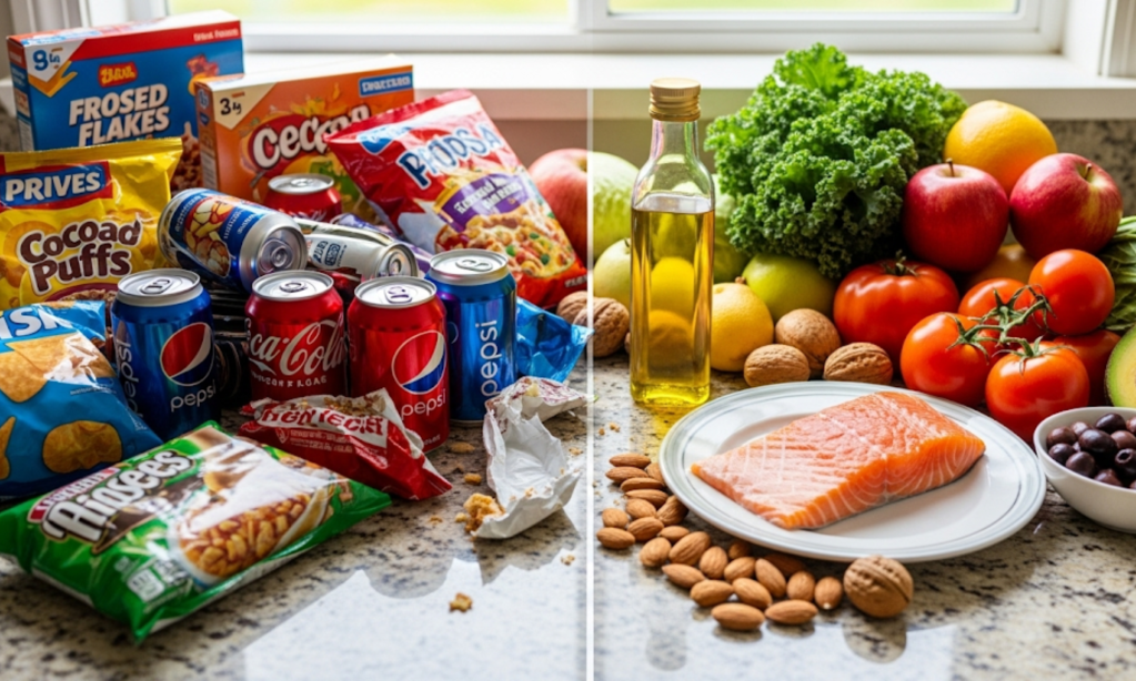 Whole foods that actually fuel you. Fresh fruit, lean protein like chicken or fish, and healthy fats like avocado, olive oil, or nuts. And yes, real food tastes good once your body adjusts.