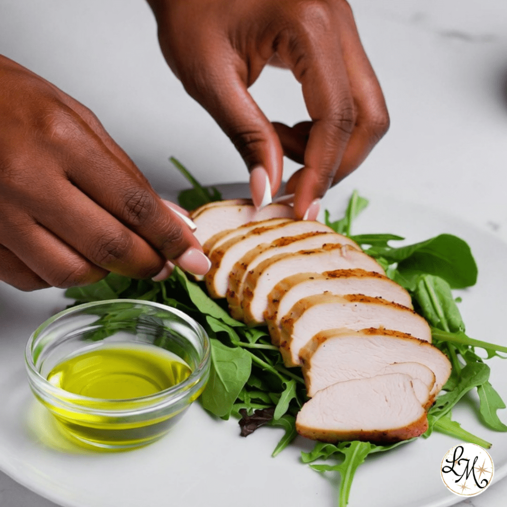 Turkey breast (150g) with mixed greens and balsamic vinaigrette.