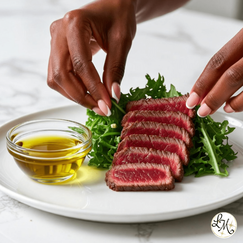 Lean beef (120g) with mixed greens and olive oil vinaigrette.