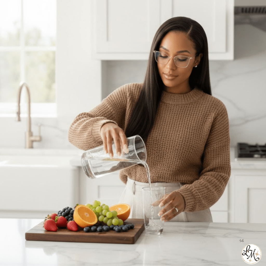 • The Liquid Gold: Water, water, and more water. You can add a slice of lemon or cucumber to keep it interesting.