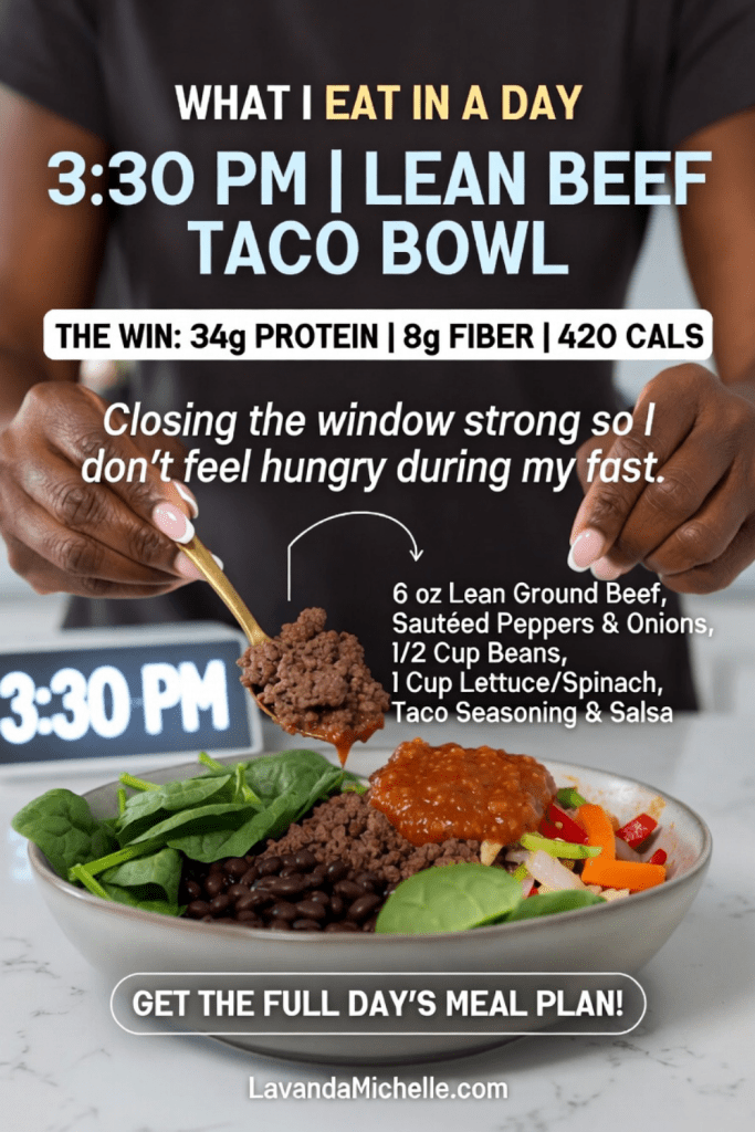 Days are all about the “Lock-In” 🔒! Check out my full WIEIAD post for weight loss: 158g protein and 35g fiber across 4 simple, budget-friendly meals. My 8am-4pm window never tasted so good. 🥗✨ #WeightLossJourney #WIEIAD #186Fasting #LavandaMichelle